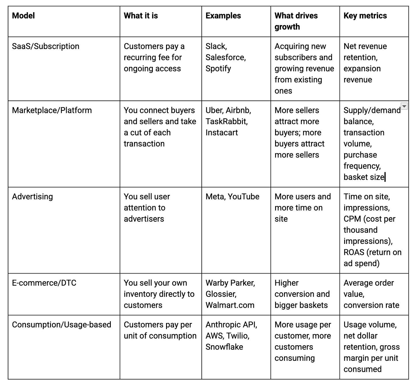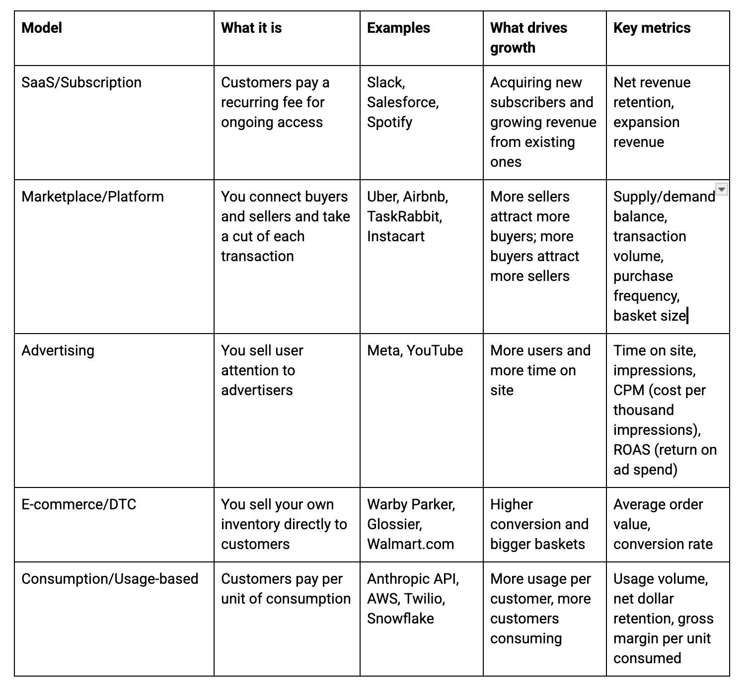 Once you understand how your company makes money, the next layer of business sense is knowing what kind of business you’re in. Different business models create different incentives and constraints, which shape what’s worth building in the first place. The five models you’ll see most often in tech: