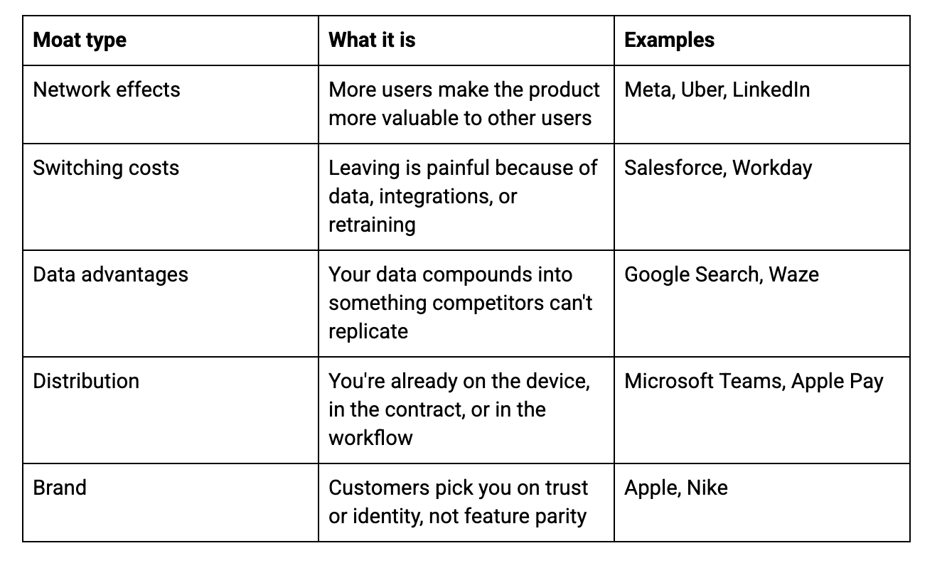 Understanding your moat is one of the most important inputs into product strategy. Your moat is a structural advantage in winning customers or keeping them - the thing competitors can’t easily copy. Good product strategy either reinforces the moat you have or builds new ones. Most companies win on one of five common moats: