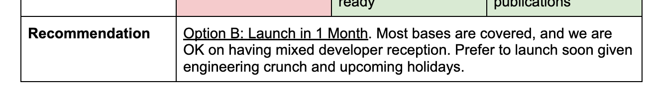 Leverage this recommendation to frame your entire discussion. I place the recommendation at the end so that readers don’t jump to your conclusion right away, and have enough mental space to think about how to arrive at their own conclusion.