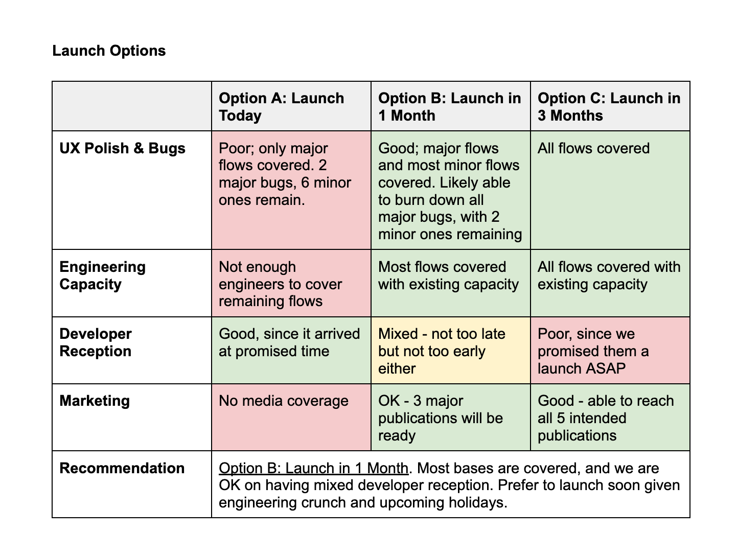 Strong options describe real choices someone might advocate for, such as different launch timelines or implementation approaches. They should be mutually exclusive so readers can clearly compare outcomes.