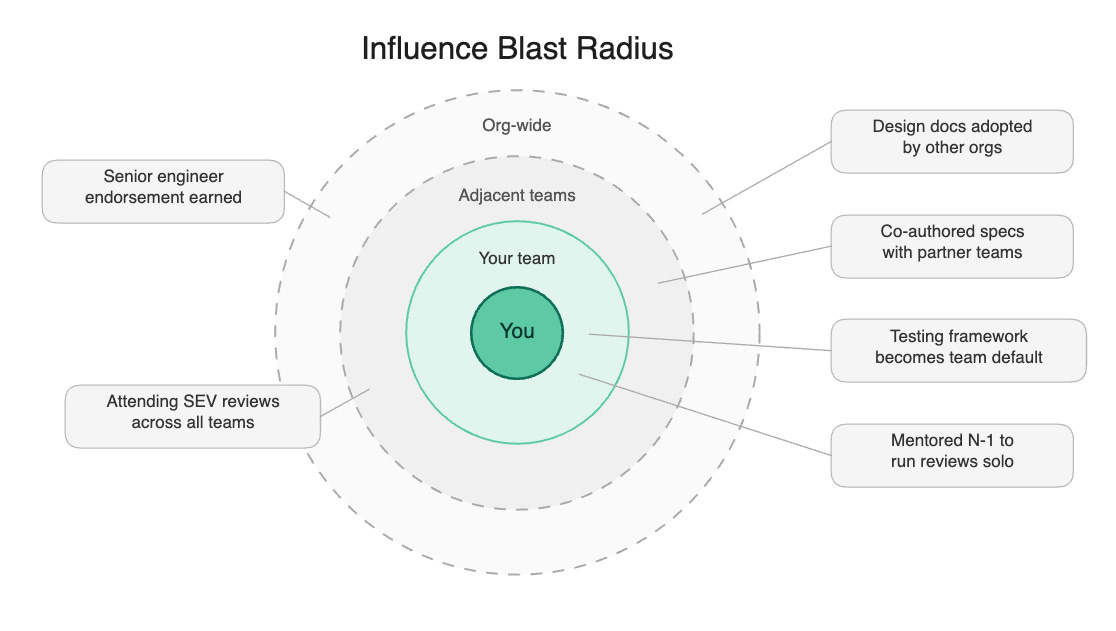 Grow another engineer. Pick someone at N-1 or N-2 and give them a real problem with risk attached. Let them draft the design doc. Let them run the review. Sit silently while they defend it. Debrief afterward. Show them where they missed stakeholders, underestimated migration risk, or overscoped the solution. Pull them into roadmap discussions. Expose the machinery. Speak with their manager about their strengths and gaps. That manager will likely sit in your calibration. Their anecdote about how you accelerated their engineer’s growth will carry more weight than your self-reported heroics.