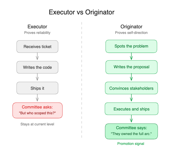 You cannot piggyback your way up the corporate hierarchy. Riding the coattails of a Staff Engineer’s architectural masterpiece proves you can follow orders. It does not prove you can captain. And that Staff Engineer has their own expectations to meet. So the promo room will ask, politely: “And how much of this was actually theirs?”